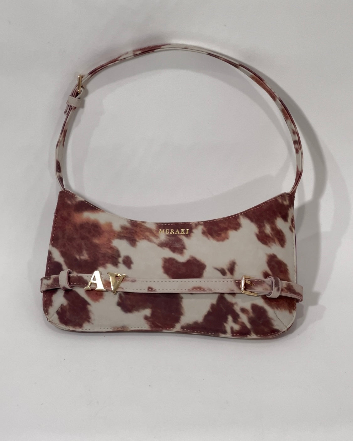 Este es un bolso de hombro con estampado de vaca en piel sintética. Strap ajustable; con al frente que puedes personalizar con Letras en herraje.